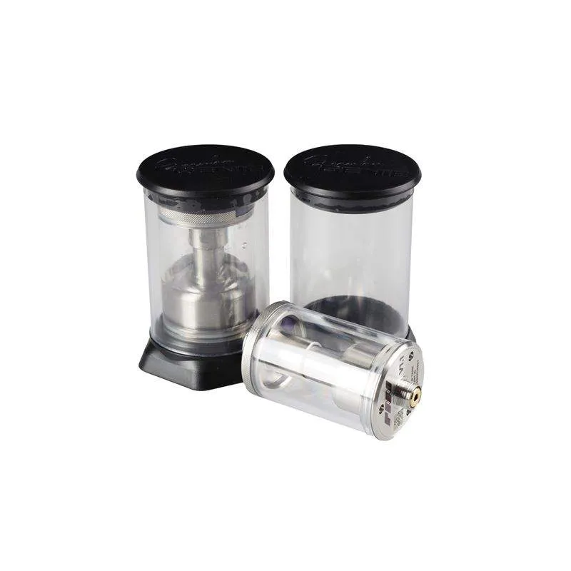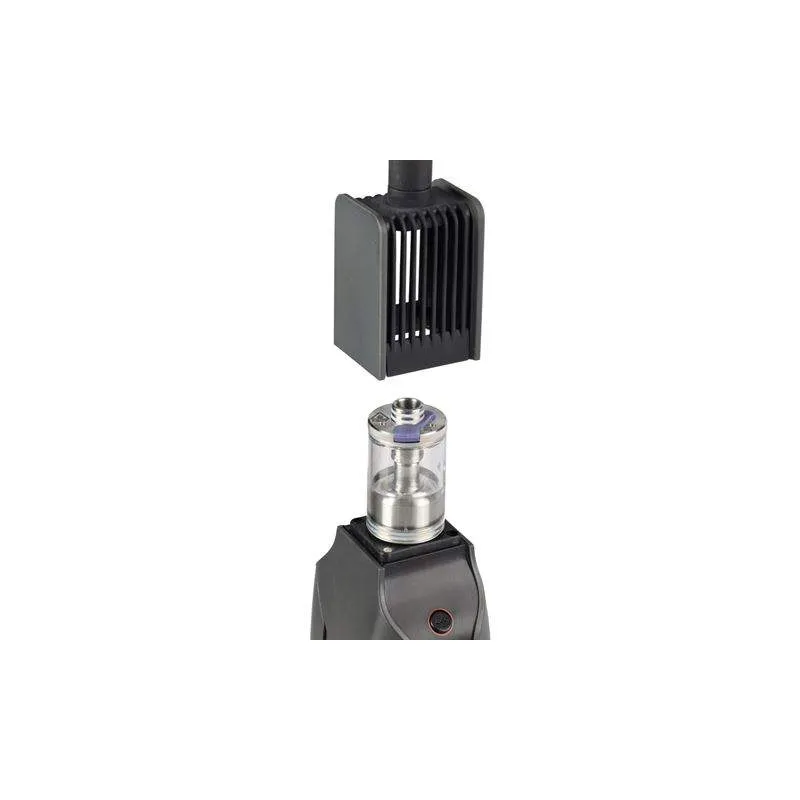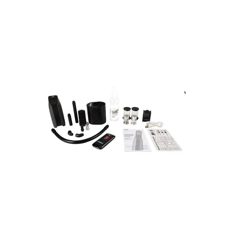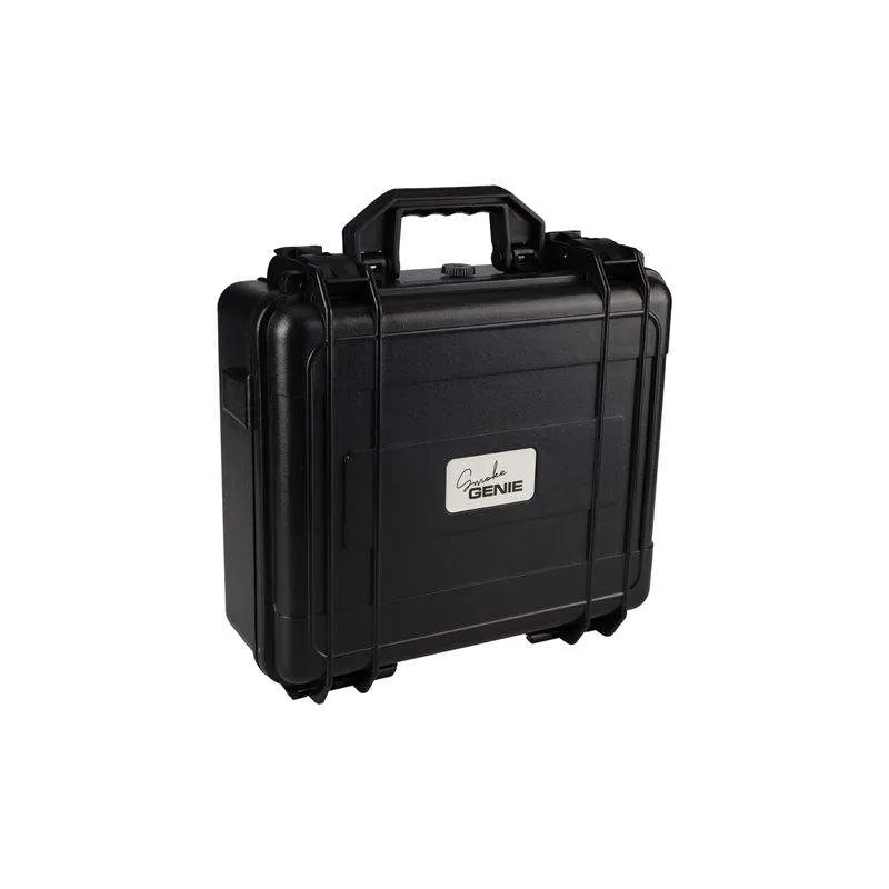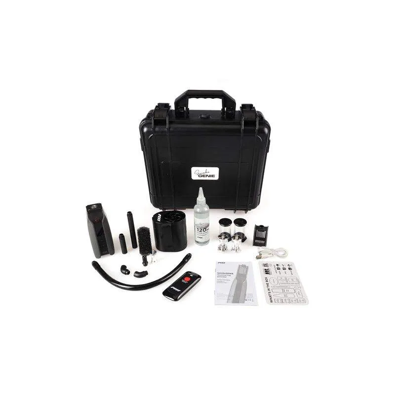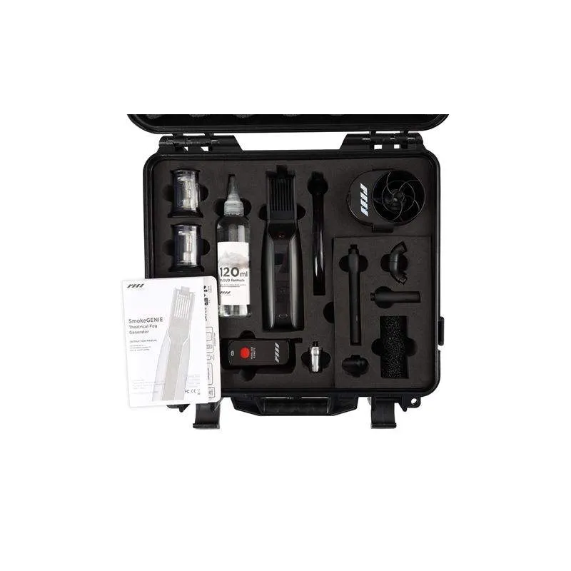 На дне есть резьба 1/4. Это позволяет прикрепить SmokeGENIE к штативу, зажиму или другому инструменту. SmokeGENIE поставляется с полным набором, включая кейс, капсулы, насадки, жидкость, пульт и вентилятор. Вам только нужно приобрести батареи.