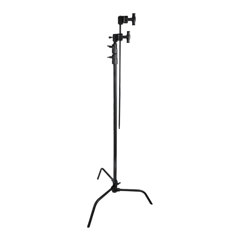 Стойка имеет две ноги, которые открываютс в фиксированных положених с помощью пружин, в то врем как треть нога регулируетс по высоте. Ослабив фиксирующий винт, пользователь может перемещать ее вверх и вниз по основной секции подъемника. Это позволет одной ноге быть поднтой выше других, выравнива стойку на наклоне или неровной поверхности. Эта функци обеспечивает оптимальную поддержку дл ваших световых голов, отражателей и гобо.