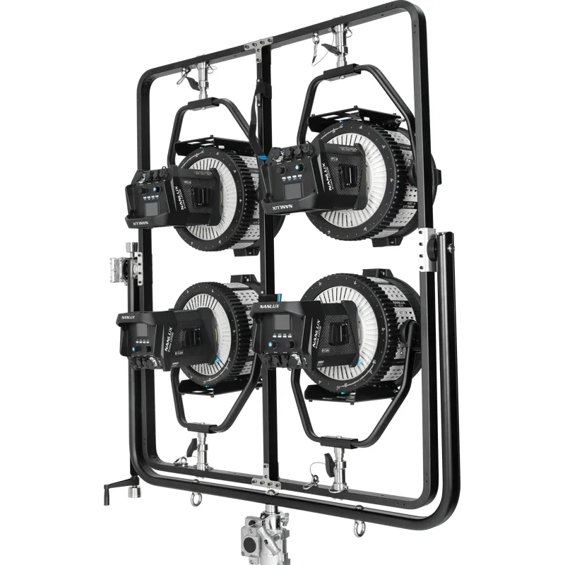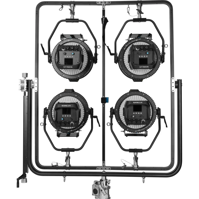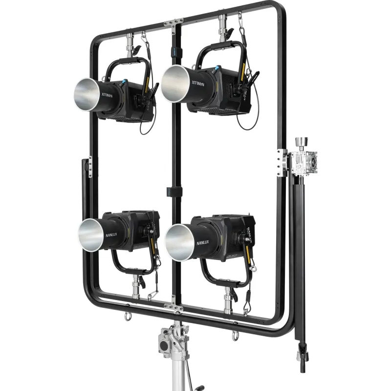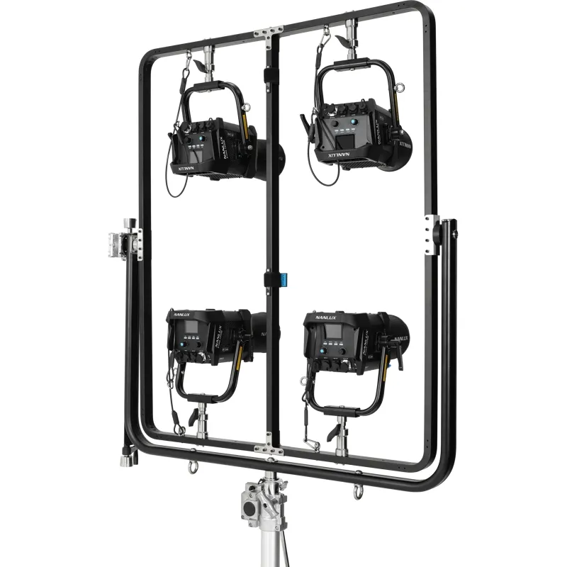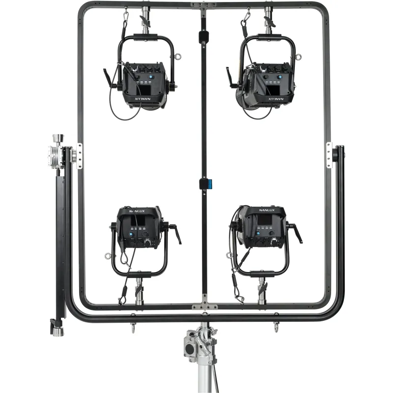 Mount four Evoke 1200s / 1200Bs using a junior pin. The Nanlux FR-JP-4 Four-light Frame with Junior Pin allows for using four Evoke 1200s or Evoke 1200Bs in a single frame. Built out of high-intensity aluminium alloy and stainless steel, offering a stable structure, high load capacity and vibration resistance. Easily mount your lights to a compatible C-stand using a junior pin. Supports 360° panning with an adjusting handle.