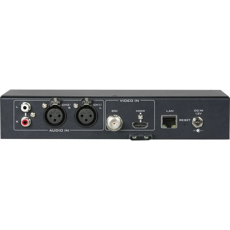 HDMI/SDI video input is supported. For audio, XLR and RCA audio inputs are provided.