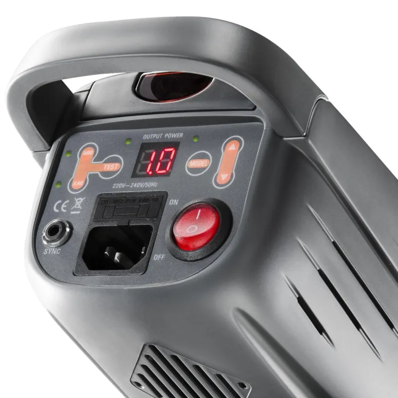 The highlights of this series include the built in 2.4 GHz receiver with 16 channels and 4 groups. When used with several flashes, each flash can thereby be separately controlled - for higher flexibility. All settings, like flash power or modelling light, can be conveniently made via the separately available radio remote trigger, but also by using the clearly arranged and user-friendly control panel on the flash itself. The power can be regulated from 1/1 to 1/32 and is infinitely adjustable, whereby the light power can be exactly adapted to the prevailing lighting conditions. The flash can be triggered via a Sync Cord, the built-in photo cell, via the test button or via the additionally available convenient radio remote trigger. A very strong cooling fan protects against failure caused by overheating.