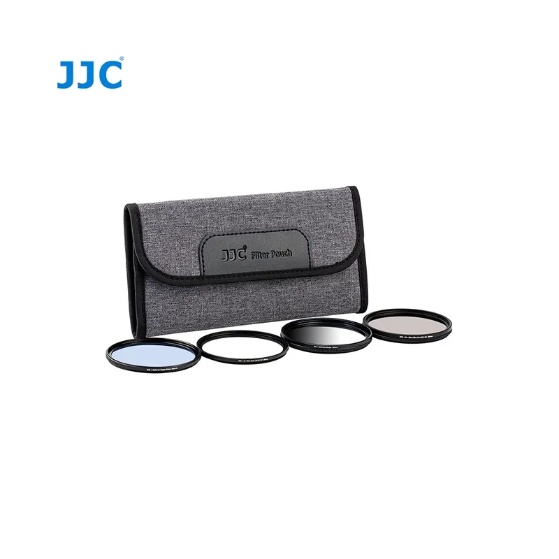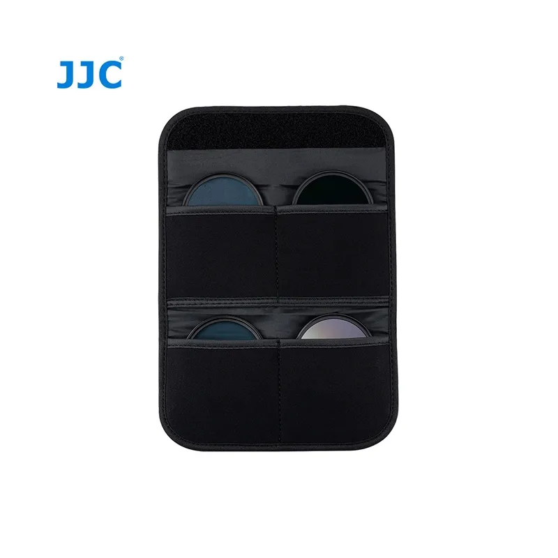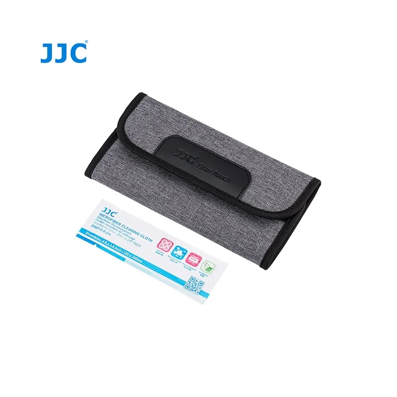 JJC FP-K4S Grey Filter Pouch holds 4 filters up to 58mm The JJC FP-K4 GRAY series Foldout Filter Pouch is specially designed for holding filters. The FP-K4S GRAY can hold 4 filters up to 58mm and the FP-K4L GRAY can hold 4 filters up to 82mm. The exterior of the filter pouch is made of high quality polyester material, sturdy and durable. Filters placed within this pouch are each held within one of four elastic pockets and can be easily accessed by opening its hook and loop closure. Additionally, the filter pouch comes with a vacuum packaged microfiber cleaning cloth, which effectively removes dust, fingerprints and oil smudges without leaving residues.