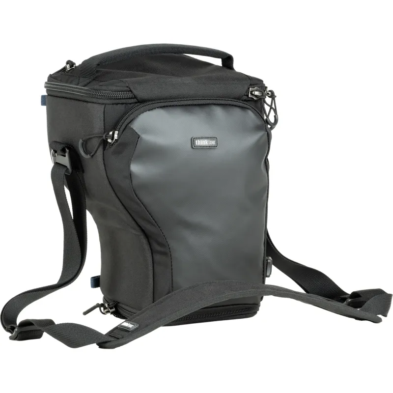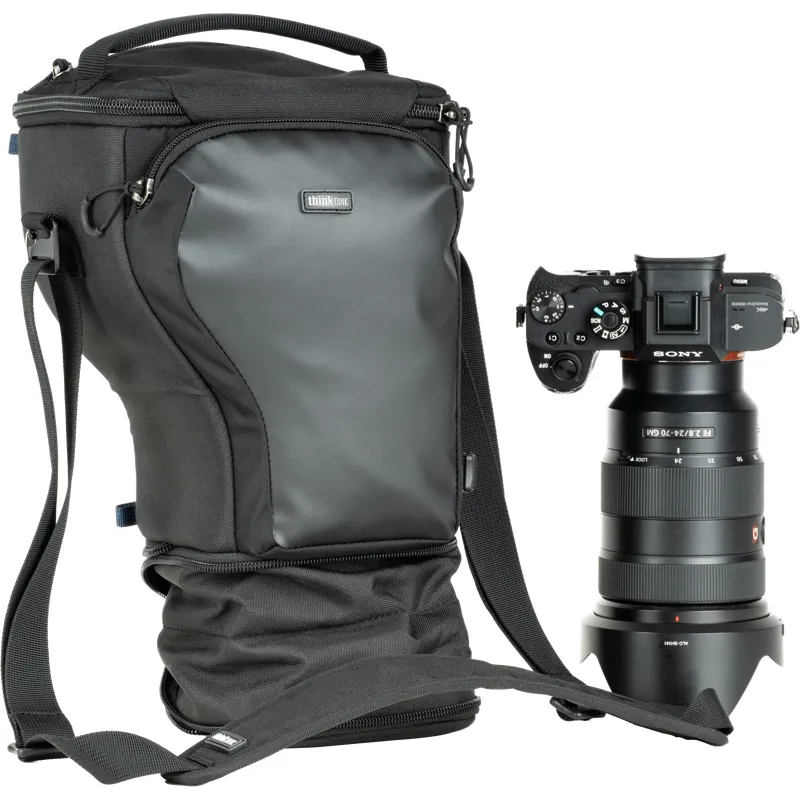 Этот холстер разработан дл стандартной беззеркальной камеры с прикрепленным объективом 24-70 мм f/2.8 (с обратным блендой). Он также может вместить объектив 70-200 мм f/2.8, когда он убран.