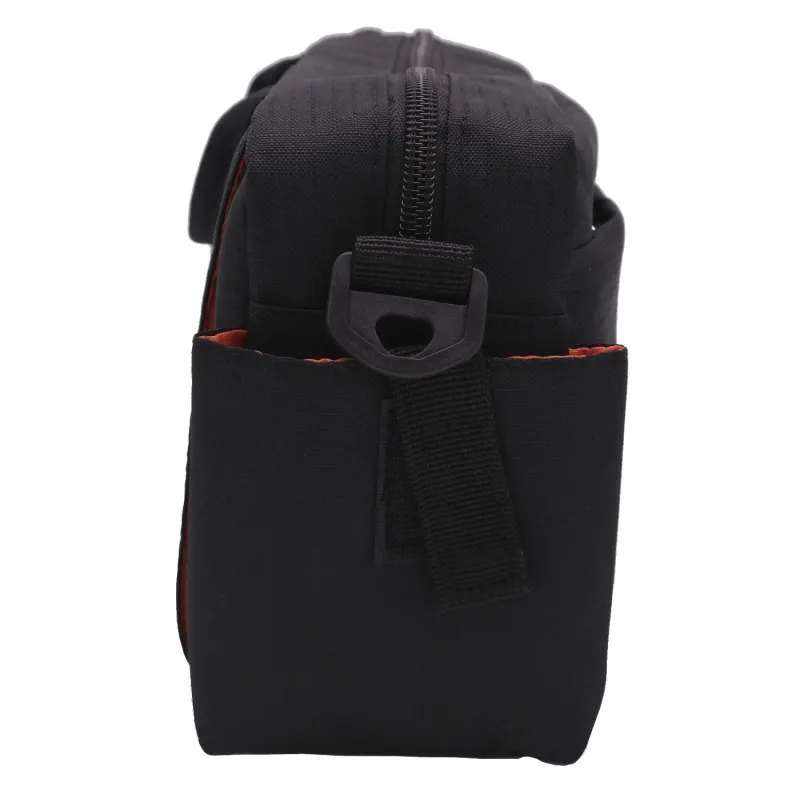 Various useful storage compartments On the front, you can find a zip pocket with handy organizers for accessories. Below is a smaller zip pocket, which can be helpful for storing cables. Both sides of the bag have handy pockets with a Velcro fastener. The bag is also provided with handles. It is also possible to wear the bag on your belt.