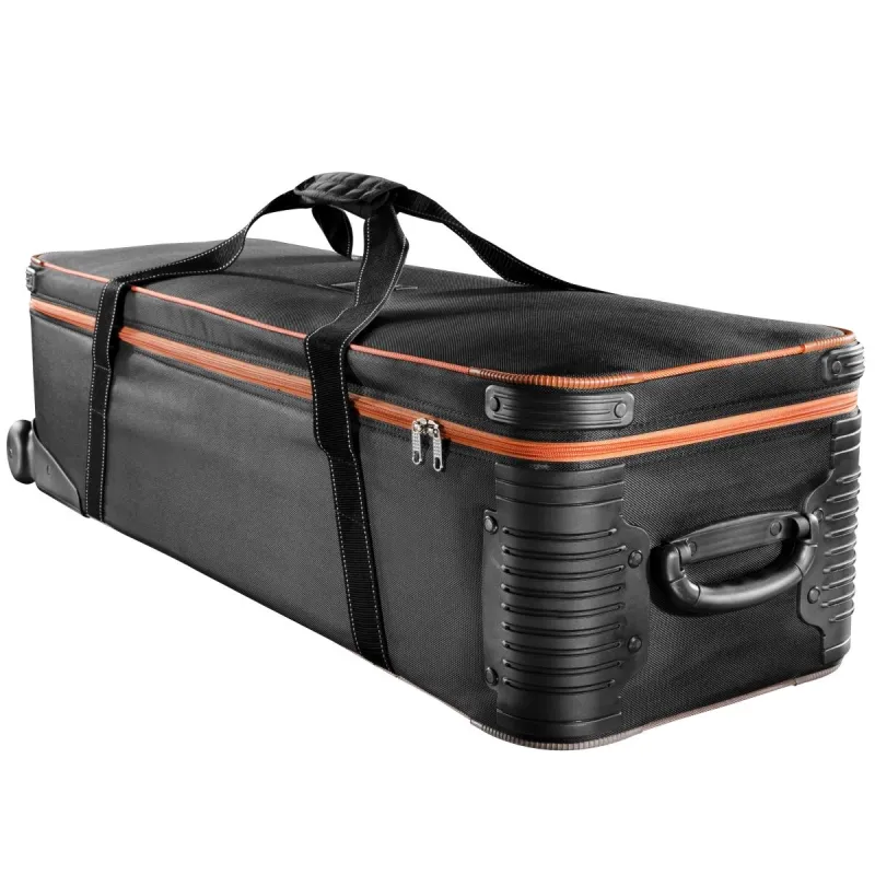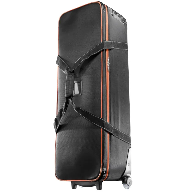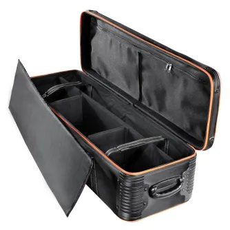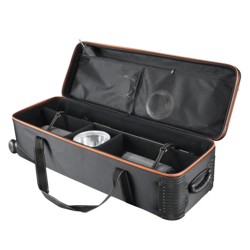 In this trolley, you can store much studio equipment. This makes it ideal for, e.g., transporting your equipment to a shooting location or to store it optimally when not in use. From the studio flash to tripods – your equipment is perfectly stored in the studio bag by walimex pro. The interior can be adjusted individually and is well-padded in order to protect sensitive devices.On the inside, the padding is joined with the corpus via a zipper; this improves the stability and rigidity of the case. Additionally, the inner compartments can be separated from the rodding, e.g. for cleaning or replacing the lining.