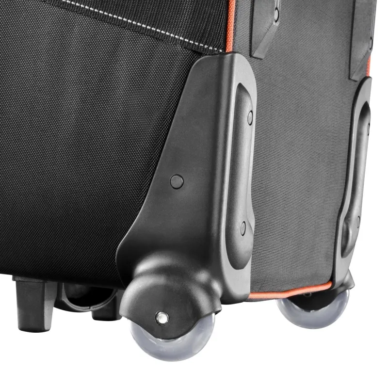 You can carry the bag on two straps and use it like a travel bag. For more comfort, especially when traveling for longer stretches or with heavy content, the bag is equipped with wheels which can be pulled like a trolley. The two wheels are sturdy and have ball-bearing. This 2-in-1 function is particularly convenient and allows you more flexibility in your daily work.