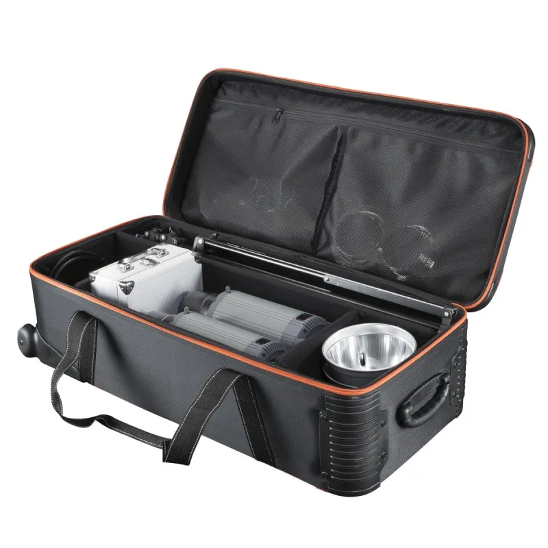 In this trolley, you can store much studio equipment. This makes it ideal for, e.g., transporting your equipment to a shooting location or to store it optimally when not in use. From the studio flash to tripods – your equipment is perfectly stored in the studio bag by walimex pro. The interior can be adjusted individually and is well-padded in order to protect sensitive devices.On the inside, the padding is joined with the corpus via a zipper; this improves the stability and rigidity of the case. Additionally, the inner compartments can be separated from the rodding, e.g. for cleaning or replacing the lining.