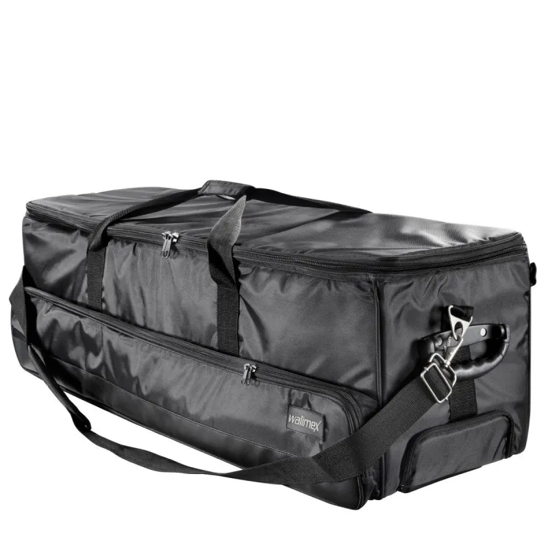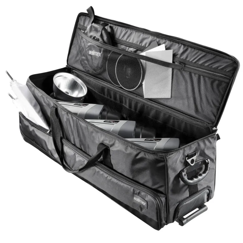 Очень большая студийная тележка обеспечивает достаточно места и надежную транспортировку вашего студийного оборудования. Тележка подходит для 3 вспышек, 3 штативов, рефлекторных зонтов, софтбоксов и многого другого. Внутреннее пространство можно регулировать индивидуально с помощью перегородок на липучках (2 диагональные перегородки, 1 промежуточная площадка, 1 съемная площадка). В нижнем отделении можно хранить штативы, софтбоксы и прочее. Кроме того, на верхней крышке сумки есть сетчатый карман для мелких деталей.