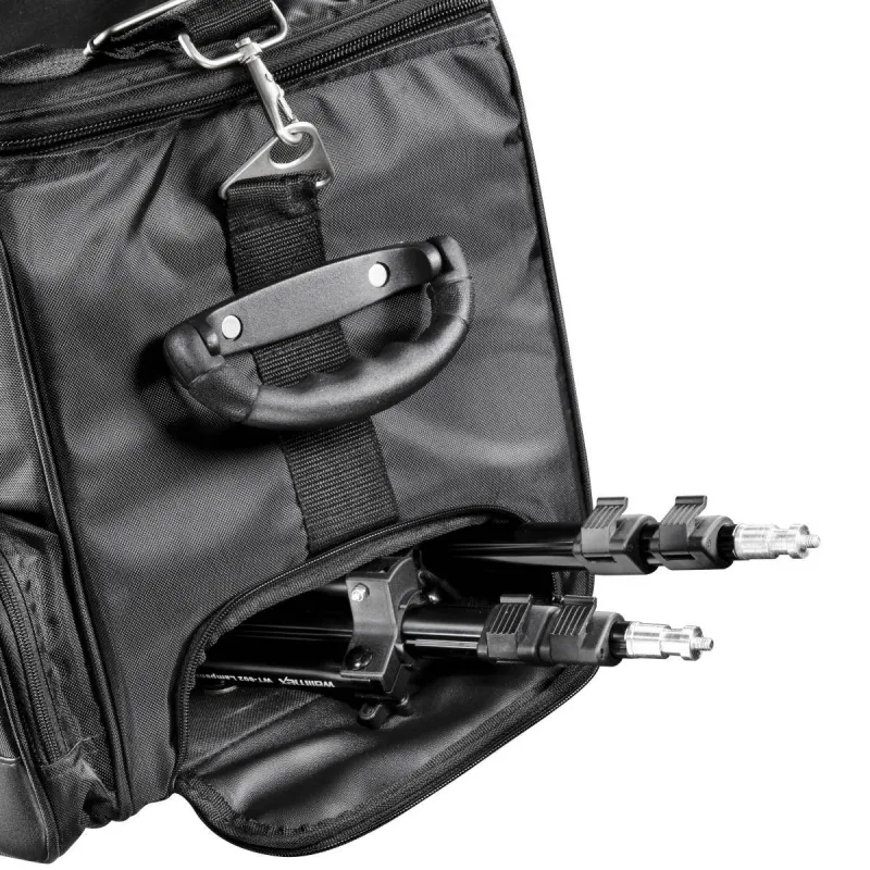 Эта студийная сумка оснащена двумя колесами из твердой резины. Вы можете тянуть ее за выдвижную ручку или за эргономичную ручную рукоятку. Регулируемый по длине плечевой ремень с мягкой подкладкой (снимается с помощью карабина) или альтернативная ручка помогут вам переносить сумку. Для защиты оборудования на дне сумки предусмотрены прочные пластиковые протекторы.