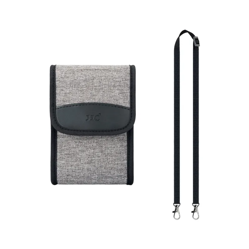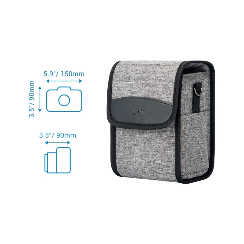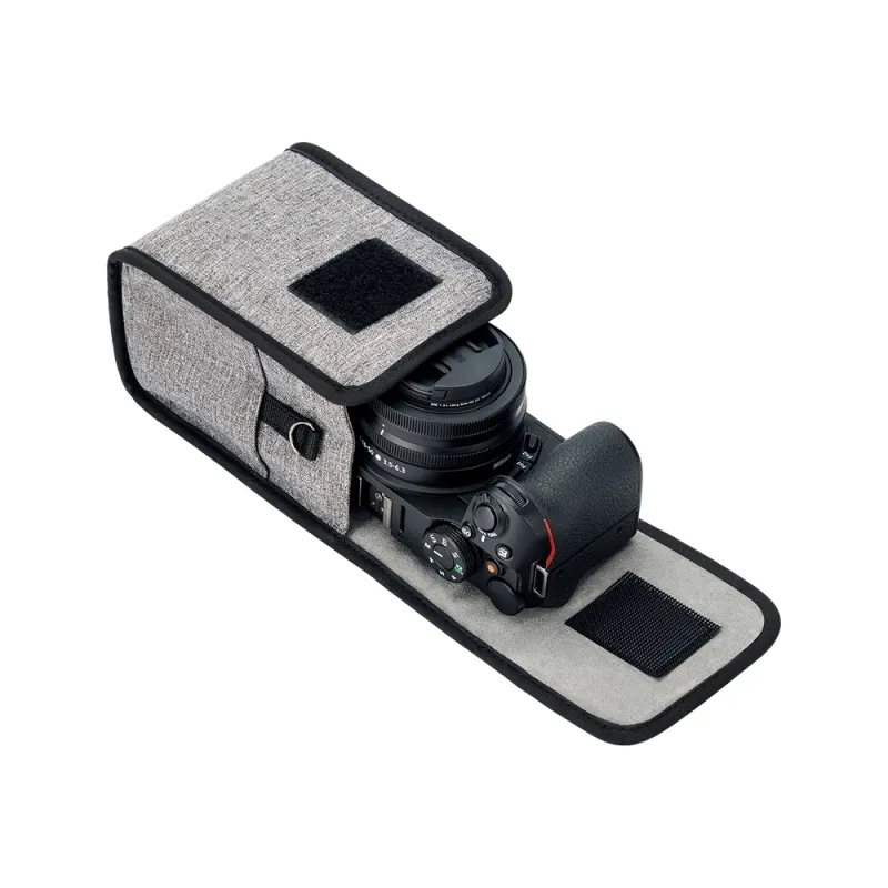 The ideal travel companion Crafted from premium polyester, this pouch guarantees durability and enduring performance. Its interior features a gentle lining, designed to protect your camera screen and lens. The flap, equipped with a reliable hook and loop closure, guarantees swift access to your equipment. On the front flaps exterior, youll find a petite pocket tailored to hold memory cards or card readers, while two side pockets cater to storing small items like batteries.