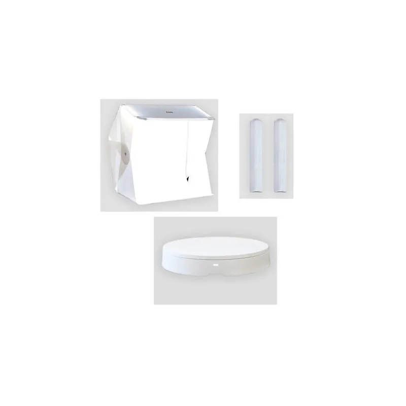 This is the best combi for photographing small objects in 360 degrees! A complete kit, which contains an innovative 360 degrees turntable with a diameter of 25cm, a Foldio3 photo tent with built-in LED lighting and a table tripod for your camera or smartphone. A combination of the LED lighting on top of the photo tent and Halo Edge lighting on the backside of the turntable make sure you have an equal white background and perfect exposed products.