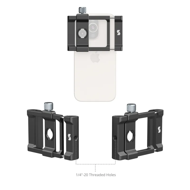 The adjustable clamp position and lock button ensure accurate alignment, preventing vignetting. Compatible with iPhone 12 to 16 series and includes 1/4 20 threaded holes for larger tripods.