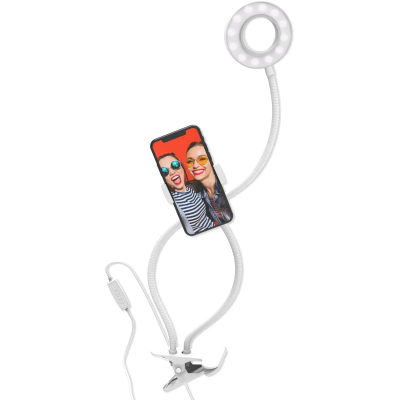 This flexible ring light with phone holder works great for videos, live broadcasts and more. It features 3 adjustable light temperatures and 10 brightness options to help you find the perfect lighting, 360 degree rotating phone holder to let you choose the perfect angle, USB powered, plug into a computer, wall charger or power bank, super strong clamp securely attaches to furniture such as desks, tables and more. This vlogging kit ring light is also compatible with all Smartphones. Phone case friendly, no need to remove your phone case for an easy to use and setup application.