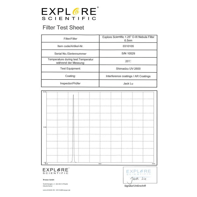 The EXPLORE SCIENTIFIC nebula filters come with an individual test certificate - your guarantee for receiving a premium filter.