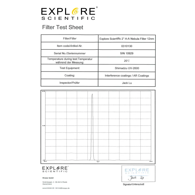 The EXPLORE SCIENTIFIC nebula filters are delivered with an individual test report - so you can be sure to get high quality filters.