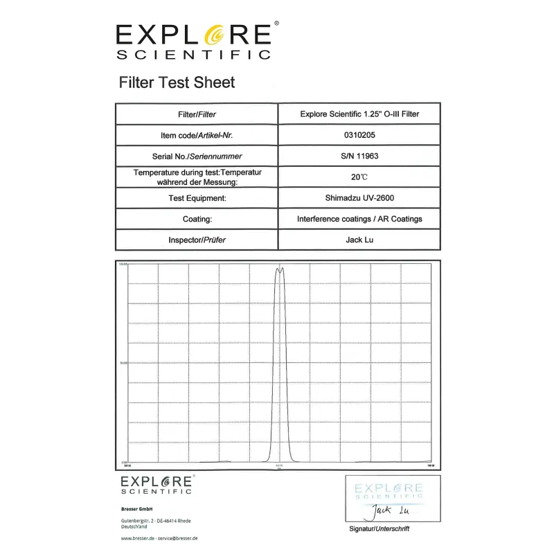 The EXPLORE SCIENTIFIC O-III filter uses a characteristic property of the so called emmission nebulae . Those objekcts glow in special colors, the so called emmission lines. Those emmission lines are linked to chemical elements - in this case oxygen. The EXPLORE SCIENTIFIC O-III nebula filter blocks all other colors (and thereby nearly all of the artificial light) and only the two emmission lines of the oxygen can pass the filter . The result is astonoishing: suddenly nebulae are visible at locations that were completely empty without filters. In suburbian skies for example the veil nebula NGC 6992 is almost not visible with a 200mm telescope. By using this filter you can see the nebula and its structures without problems. A must for every visual observer. The EXPLORE SCIENTIFIC nebula filters come with a individual test certificate - your guarantee to receive a premium filter.