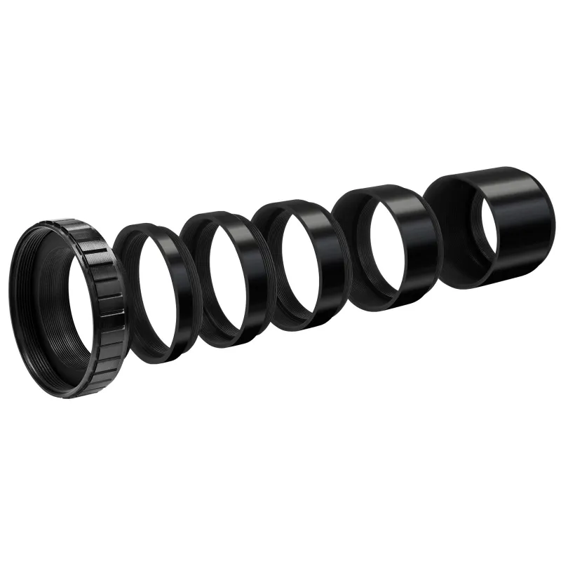 Set of 5 extension tubes with T2 thread on both sides for exact distances and secure hold of cameras for astrophotography. Also comes with SC to T2 thread adapter.