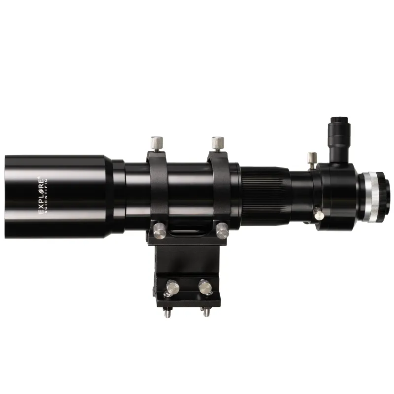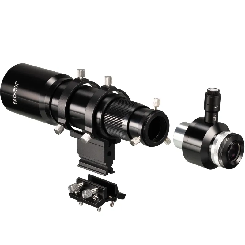 Use as mini travel telescope This viewfinder and guide telescope can also be used quite simply as a mini travel telescope. With the optional eyepieces, a magnification of 9x to 50x can be achieved. Nearly all eyepieces with a focal length of 5 to 26mm and 1.25 inch/31.7mm plug connection are suitable. Especially recommended are the EXPLORE SCIENTIFIC eyepieces of the 52 degree (Art. 02195xx) and 62 degree (02196xx) LER series. Note: Only straight view use is possible. Metal viewfinder holder and viewfinder shoe The mount of this viewfinder and guide telescope is completely made of aluminium and is a stable base. The viewfinder mount is suitable for many common types of telescopes, such as EXPLORE SCIENTIFIC, BRESSER MESSIER etc. If the existing viewfinder shoe is not compatible, a matching viewfinder shoe is also included. This can be attached to the telescopic tube by means of four M5 screws. The bore distances of the viewfinder shoe are 31.7mm on the longitudinal and transverse axis. The six large adjustment screws with non-slip knurling make it easy to align the viewfinder, even with clammy fingers. All adjusting and clamping screws have plastic tips that effectively prevent the viewfinder housing and viewfinder mount from being scratched.