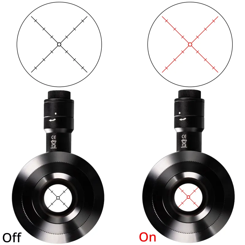 High quality 10x60 viewfinder telescope with adjustable crosshair illumination Image sharpness and viewing characteristics lift this viewfinder well above the level of the usual 10x60 viewfinder scopes. The visible image is bright and crisply sharp. Furthermore, this viewfinder has a very large field of view (FOV) of 6.0 degrees. This makes finding and adjusting objects much easier. The existing scale markings (pitch=0.85 degree) on the crosshair are a good reference for estimating distances, and the open centre markings also make it easier to centre objects precisely. All lens surfaces are protected against weathering by multi-coating and guarantee a bright viewfinder image due to the high light transmission values. The adjustable red LED illumination unit is powered by two LR41 coin batteries. The main lens and the crosshairs can be focused independently of each other, giving you perfect focus for your eyes.