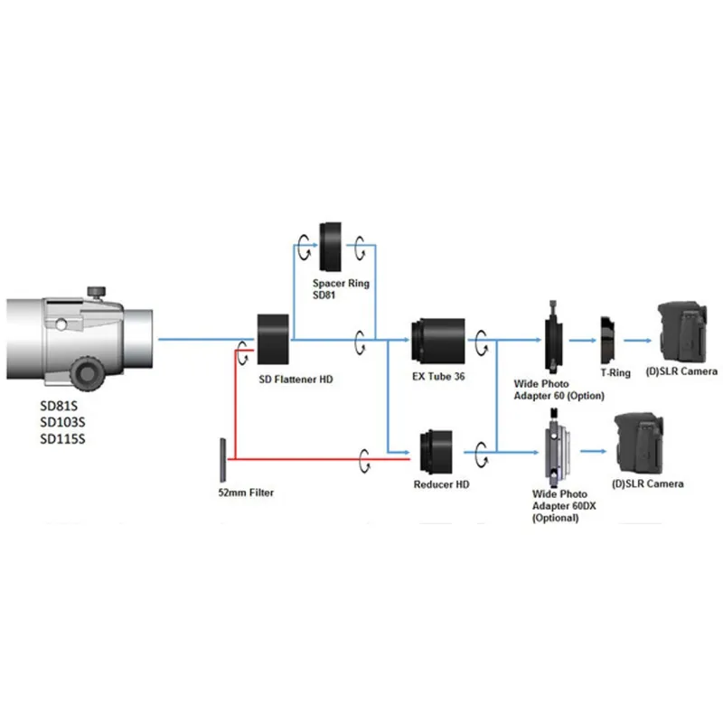 Reducer HD in combination with SD telescopes The Reducer HD can be used on telescopes from the SD series (SD81S, SD103S and SD113S) with the SD Flattener HD Kit (item #37246) . The Reducer HD reduces the focal length by a factor of 0.79x (f/7.7 to f/6.1) and delivers a razor sharp image over the entire 44 mm image sensor surface on DSLR cameras.