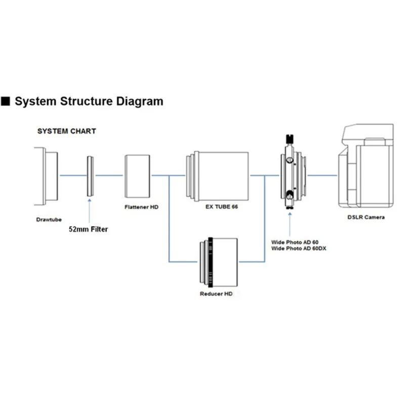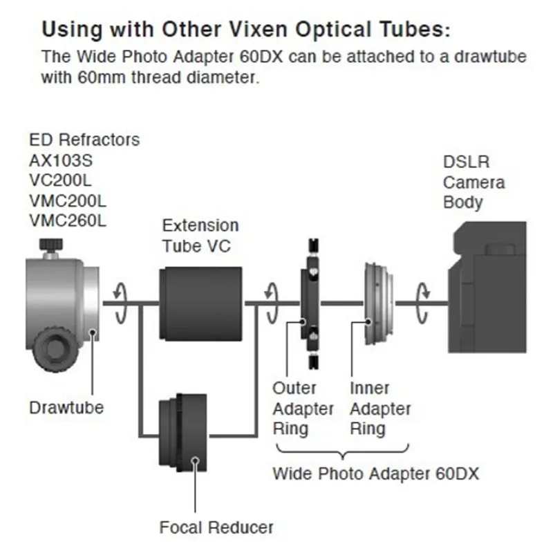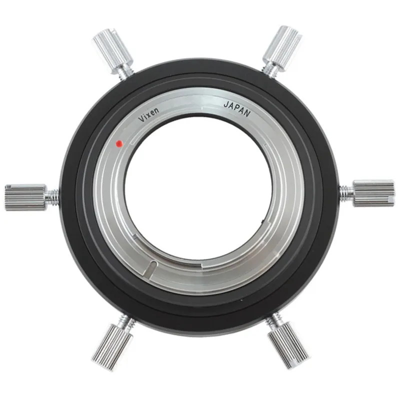Vixen 60DX Focal adaptor for Canon EOS Cameras This Vixen 60DX is a photographic adaptor for Canon EOS cameras, for use with telescopes with a 60 mm focuser drawtube connection thread. A redesign by Vixen uses new tougher materials for a more solid connection and also offers an accurate, well-machined camera rotator ring, in order to help frame your images perfectly. Camera-Adaptor for Canon EOS with 60mm Focuser connection thread Large inner diameter for full-format cameras, helping to minimise vignetting 6 locking 60° spaced bolts to hold the camera’s rotation in position Dimensions: 81mm x 30 mm / weight: 190g The option of using 6 long or 6 short fixing screws for the rotator The Vixen 60DA Focal adaptor connects your Canon EOS DSLR Camera to a telescope with an appropriate 60 mm Focuser Drawtube Thread . Thanks to the use of new materials and an improved design Vixen was able to considerably uprate both precision and durability , when compared to conventional rotational camera adaptors. Two sets of rotational locking bolts (Long and Short) are supplied. The longer ones are knurled and easy to turn by hand. The shorter options help to prevent marring of the camera casing, when using certain designs of camera and are also much less easy to turn by hand, increasing security if you need the camera locked in a particular rotational position for longer periods. The large inner dimension of this adaptor prevents vignetting at the edges of the image when using full frame DSLR cameras .