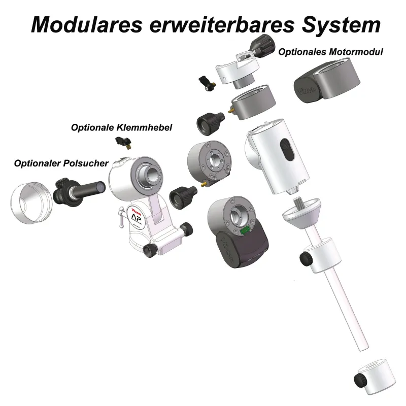The AP mount provides a secure, stable support for your telescope. Thanks to the slip clutch mechanism , the mount can be adjusted quicky to the target object.