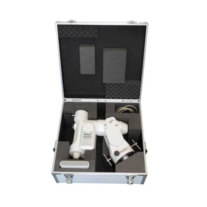 The Vixen carry case is specially designed for secure storage and transport of the SPX2 mount . It also has space for the StarBook TEN controller, the StarBook cable and the AC adapter . The housing is new from a newly developed material called Plapearl , which is highly weather-resistant and lightweight . The special design featuring two plastic plates with vacuum-moulded cylinders reduces the weight by 36% compared with conventional aluminium materials .