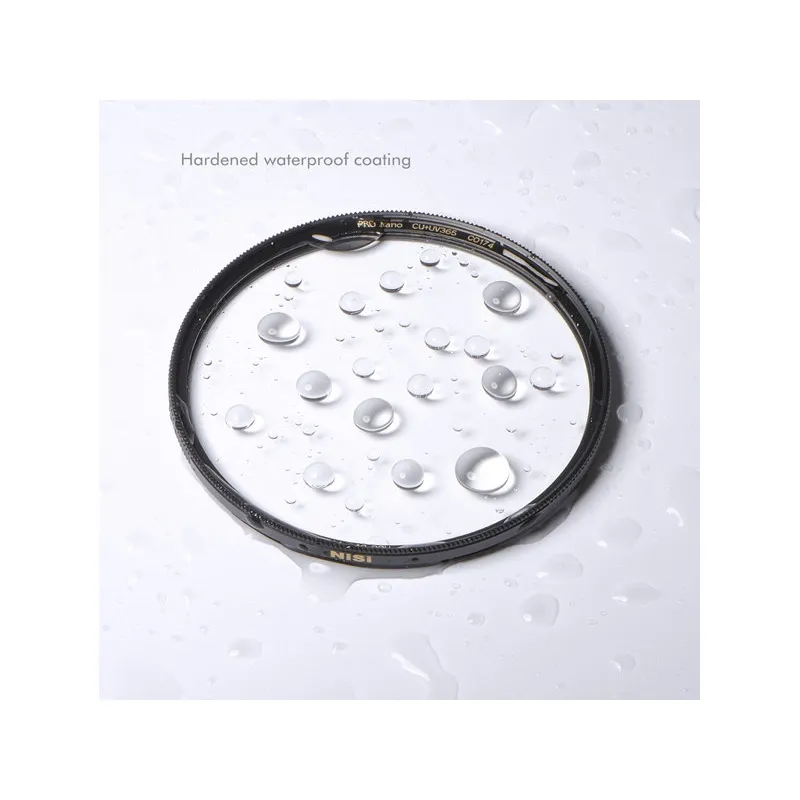 NiSi PRO Nano HUC UV ultratyndt filter har en dobbeltsidet flerlags anti-refleks-coating på UV-absorberende optisk glas af højeste kvalitet fra Japan. Dette gør, at refleksionen bliver minimal (0,3%), og at filteret slipper mere end 99,2% af lyset igennem. Filterringen er lavet af messing med stor præcision, og har en tykkelse på kun 3,5mm, hvilket gør, at dette ultratynde filter også passer perfekt til kraftige vidvinkelobjektiver uden at skabe vignettering. Filteret har også en superhård "U"-type Nano-coating, hvilket gør overfladen ekstremt slidstærk over for vand og olie, og gør det nemt at rengøre.