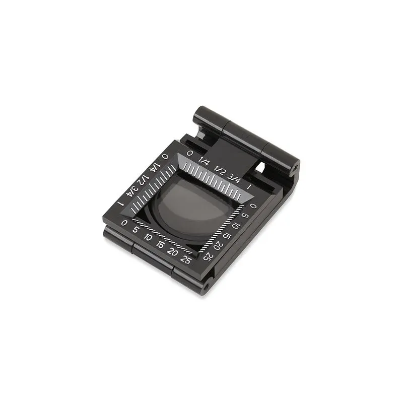 The magnifier's housing has a measurement scale engraved on it. This can be read in both millimeters and inches. The scale division runs in millimeters from 0 to 25 mm and in Inches from 0 to 1. This allows you to determine the size of an object.