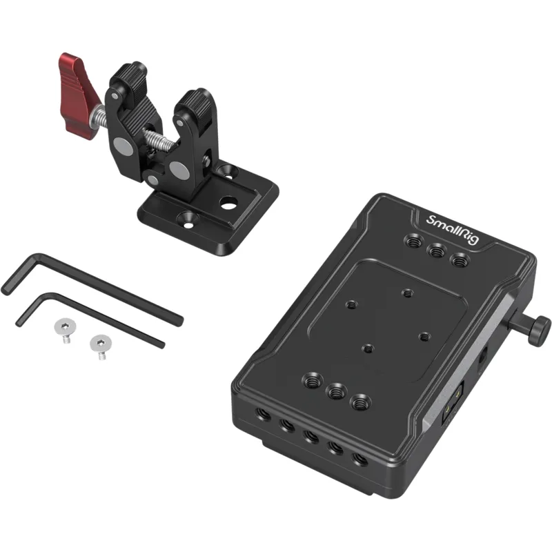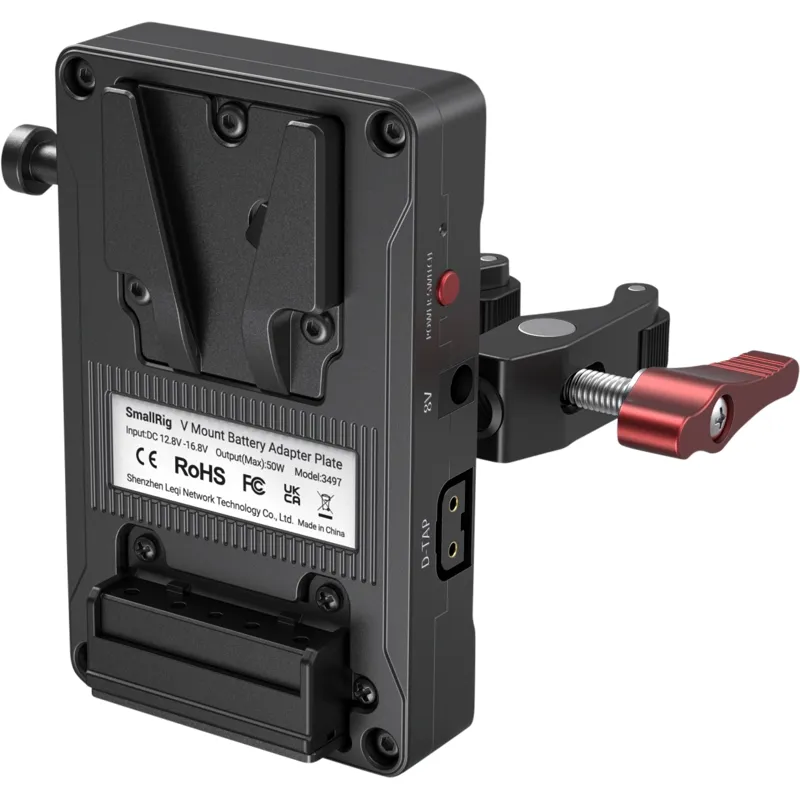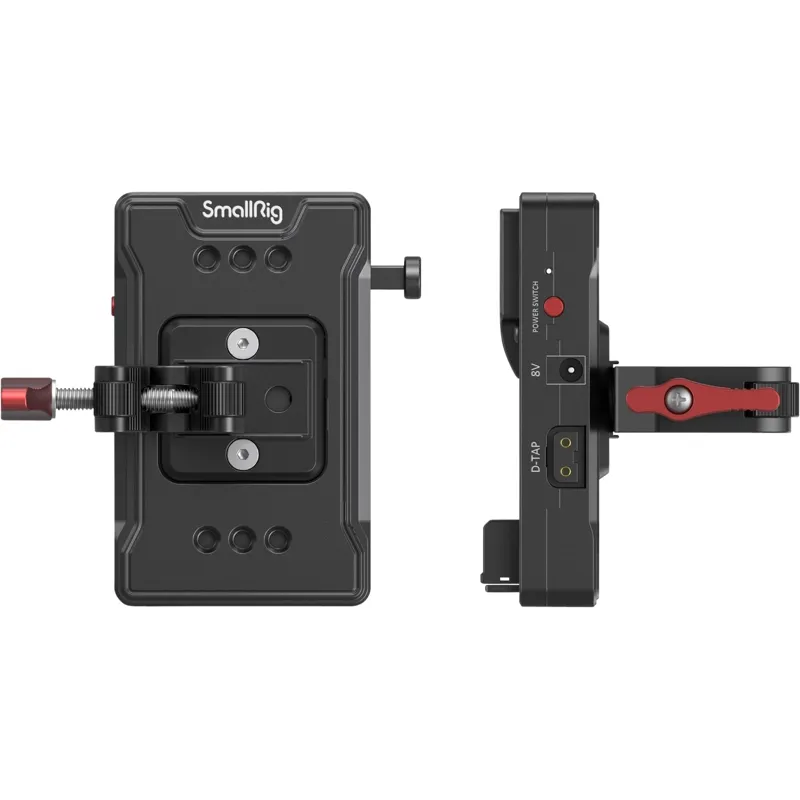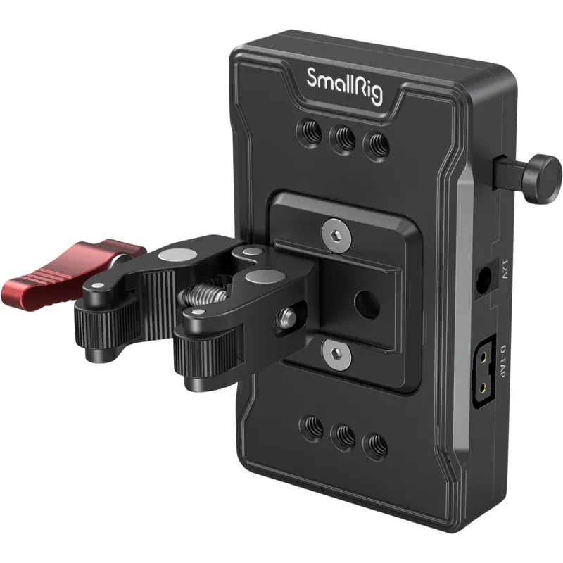 SmallRig V Mount Battery Adapter Plate (Basic Version) with Crab-Shaped Clamp 3497 is designed to provide greater battery life to your camera rig via a V mount battery. Its standard quick-lock V mount supports most V mount batteries. Output ports, including an 8V DC port, a 12V DC port, and two 14.8V D-Tap ports, work with a V mount battery to power your camera and other equipment (e.g. monitor, transmitter, follow focus, mobile phone, etc.). It features a power switch that controls all of the output ports more quickly and conveniently and comes with a super clamp mount that fits rod diameter from 15mm to 30mm to help mount a V mount battery to a tripod, a light stand, or a handheld ring for gimbals. In addition, multiple 1/4”-20 thread holes allow attaching other accessories such as dual rod clamp and magic arm.