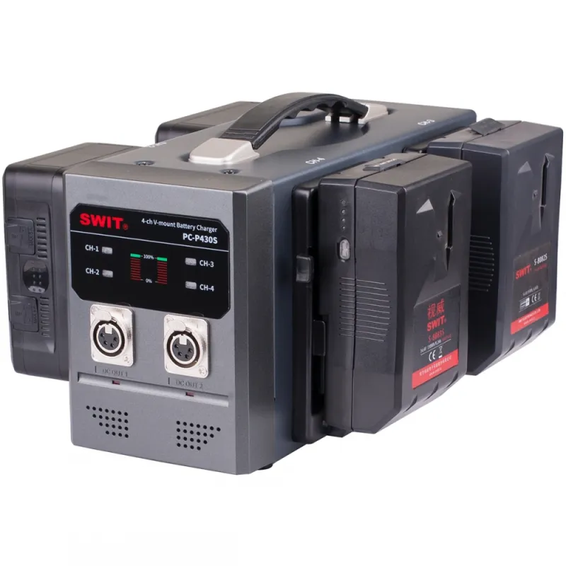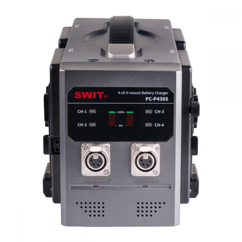 PC-P430S can charge 4pcs V-mount camera batteries simultaneously. The charging output is DC16.8V, 3A each channel.