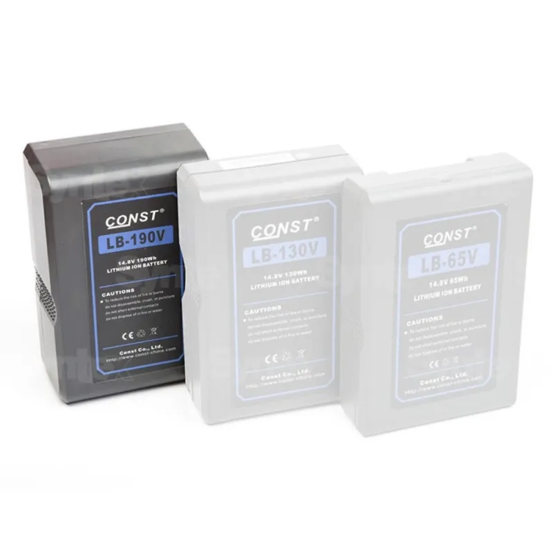 Литий-ионные аккумуляторы CONST для камер V-Mount совместимы со всеми профессиональными камерами, питающимися от аккумуляторов Sony V-Mount (например, BP-L40, BP-L60 или BP-L90) с напряжением 14,8 В. Помимо соответствующих клемм (D-Tap, круговой контакт), аккумуляторы оснащены четырехсегментным светодиодным индикатором, отображающим состояние заряда. Разумеется, предусмотрены цепи защиты от нештатных токовых или вольтажных нагрузок, а также от недопустимой температуры батареи