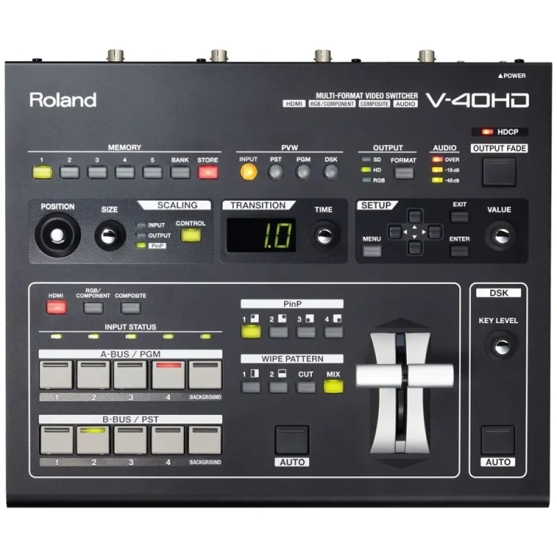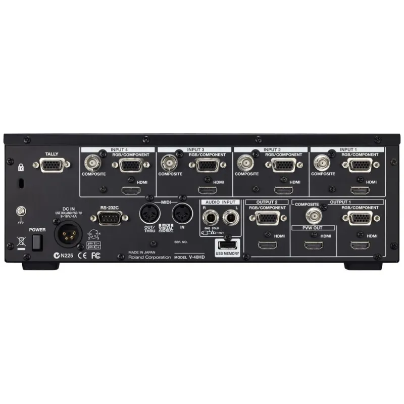 Roland V-40HD имеет двенадцать входов на четыре канала плюс один (фоновый) и 5 выходных разъемов с независимыми скалерами на входах и выходах, что позволяет подключать источники HDMI/DVI, RGB, компонентные и композитные. Он поддерживает входные/выходные разрешения до 1080/60p или 1920x1200. V-40HD совместим с HDCP, что позволяет смешивать защищенный от копирования игровой контент и Blu-ray с другими компьютерными и камерными источниками. Он оснащен выходом мультивизора, который обеспечивает удобное решение для мониторинга при подключении к монитору HDMI.