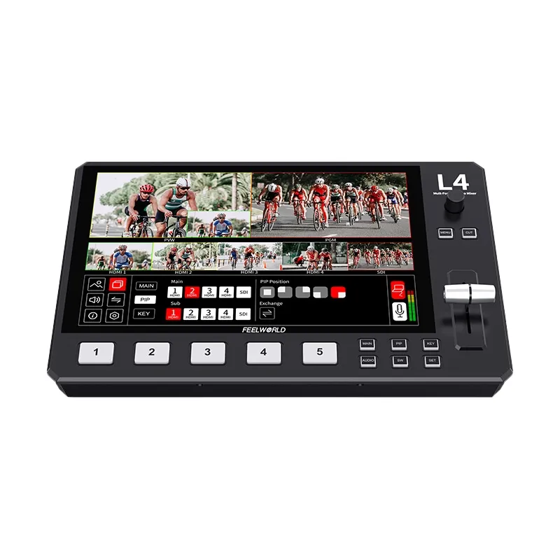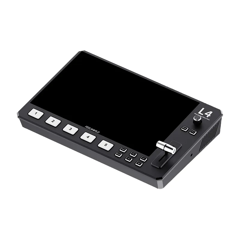 Коммутируйте, управляйте и транслируйте видеоконтент в реальном времени, используя один SDI и до четырех HDMI видеоисточников, с помощью L4 HDMI Livestream Switcher со встроенным 10,1" ЖК-монитором от FeelWorld. Этот компактный видеокоммутатор может переключать до пяти входов, выводить видео программы и предварительного просмотра через HDMI и SDI, а также передавать видео в формате 1080p60 через USB 3.0 с помощью компьютера и стороннего программного обеспечения для потокового вещания. На сенсорном дисплее 10.1" можно просматривать до семи изображений, включая пять отдельных входов, предварительный просмотр PGM и предварительный просмотр PST.