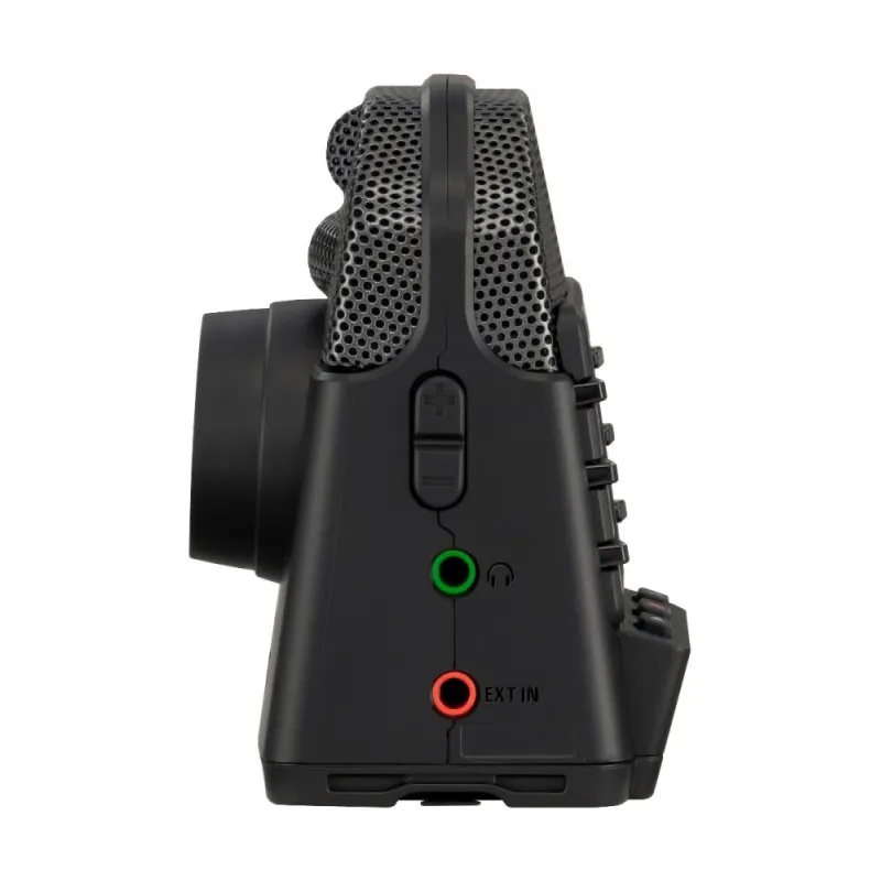 The Q2n-4K's stereo condenser mics are arranged in an X/Y pattern and can handle sound pressure levels up to 120 dB, standing up to even loud rock stages. An audio-only mode records standalone WAV files up to 24-bit/96 kHz. Audio functions include auto gain, a low-cut filter, a 3.5mm line-in/mic-in port, and a headphone output.