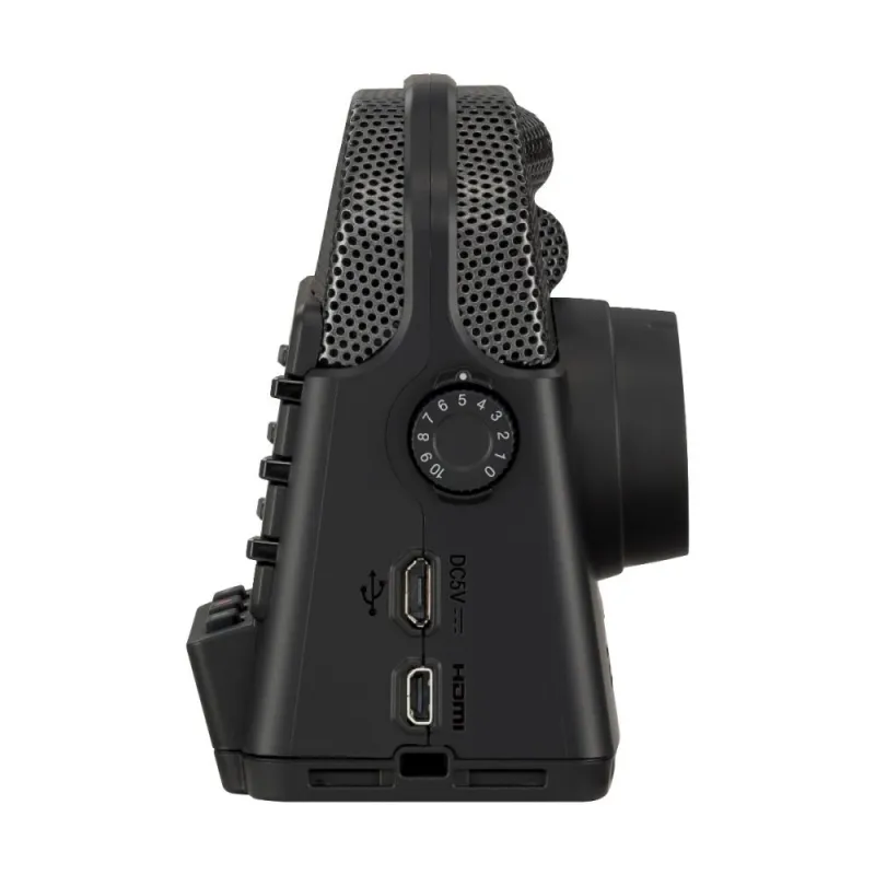 To view your video recording in high definition, you can connect to an HDMI TV using the micro-HDMI type D output. A micro-USB port allows for connection to a computer or iOS device (requires separately available adapter) so you can use the Q2n-4K as a web camera for live streaming, as a USB microphone for podcasts, or as a card reader to transfer recordings (computer connection only).