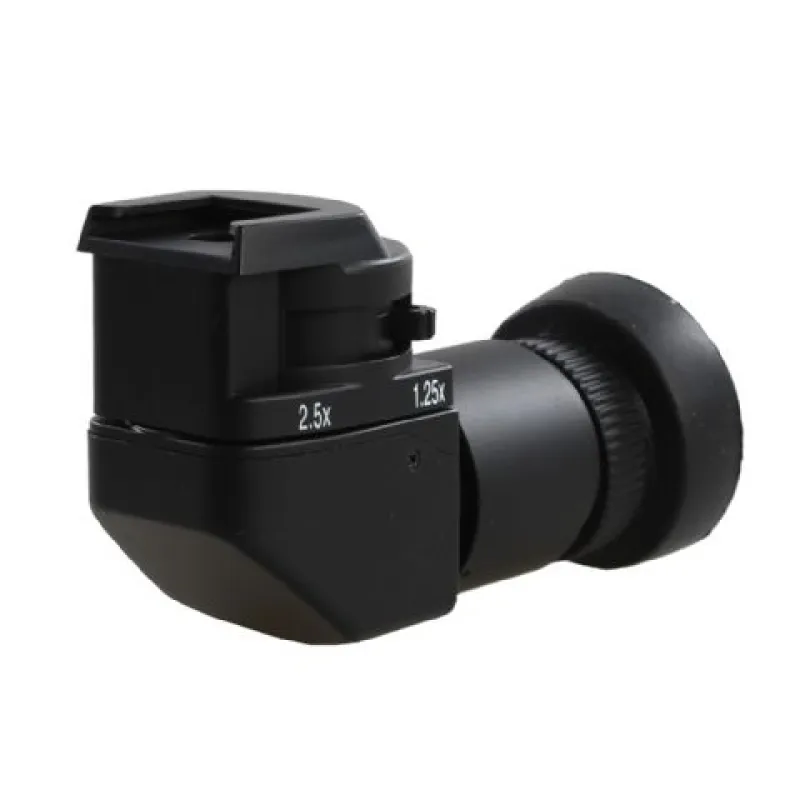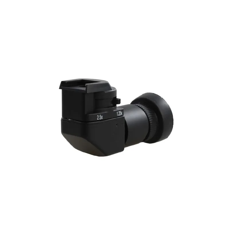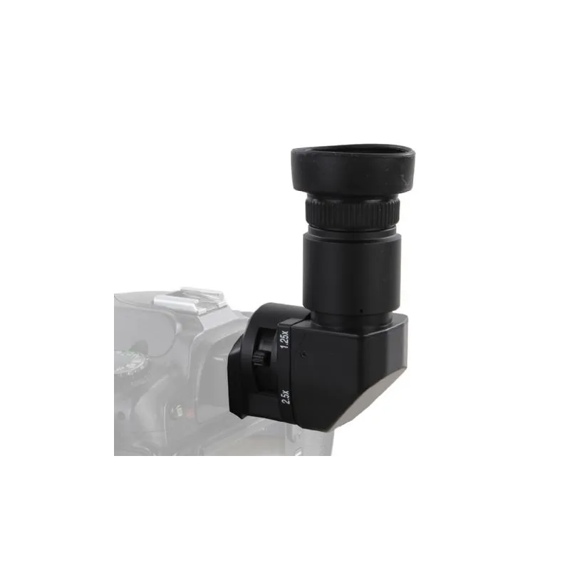 The StudioKing Right Angle Finder CRAF25 should be mounted on the viewfinder of your camera. Through this angle finder can look through the viewfinder of the camera at an angle of 90 degrees. This can be handy when shooting from high or low positions. The magnification (1.25X or 2.5X) can be determined by using the switch. In some cases, you must use a connection adapter.