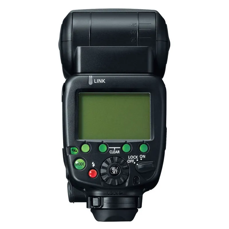 The Speedlite 600EX II-RT's dot matrix LCD panel graphically displays detailed flash modes, Custom and Personal Function settings and status indicators for both master and slave units, enabling wireless configurations with more detailed information than previous flashes. A new flash-readiness indicator means the flash status can be confirmed in an instant, and backlit operation buttons mean high visibility in both bright and dark environments.