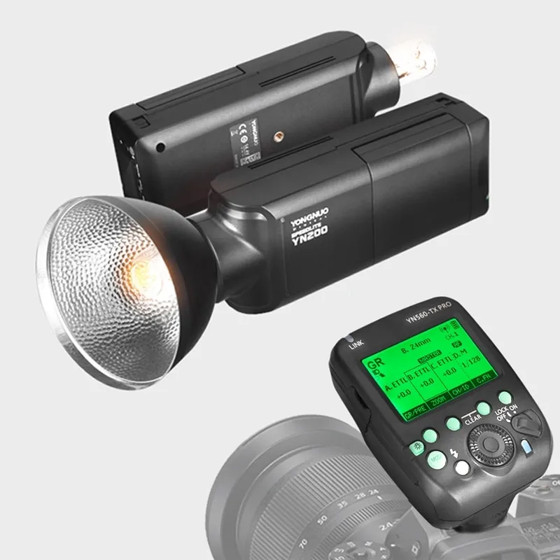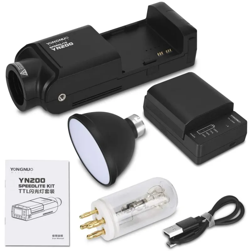- Supports YONGNUO new upgraded RF radio flash system - It can receive the controlling and triggering signal from the TTL master unit such as YN862 series, YN560-TX PRO series , realizing TTL and M/Multi mode off-camera flash; It could receive the controlling and triggering signal from the wireless flash trigger such as YN560-TX (II)/RF603/RF605 wireless flash trigger, realizing M/Multi mode flash. - Using removable bare tube lamp tube, GN60 high index - GN60@ ISO100 (using reflector cover). Supports TTL flash, manual flash, multi flash, high speed synchronization, up to 1/8000 seconds. - 16 channels, up to 10,000 configurable photographer ID, six flash groups A/B/C/D/E/F. - Equipped with attachment bayonet, accessories such as reflective cover can be installed. - It is equipped with large capacity battery with imported cell, using Type-C interface charger, which supports quick charging with PD protocol power adapter (excluded). - Supports USB firmware upgrade - Equipped with Micro USB interface, supports firmware upgrade, users can log in the Yongnuo official website to download the firmware upgrade package to upgrade the flash. - Supports wireless optical slave function. - It can receive the master optical control signals of Yongnuo,C/N, and supports S1 and S2 pre-flash cancel trigger mode. - Equipped with 3.5mm synchronization jack, supports synchronization interface flash. Specifications Model: YN200 Flash output:200W Guide No:60@ISO100 (using the reflector) Color temperature:5600k Power supply: 14.4V 2900mAh lithium battery Recycle time: About 0.01-2S Power Adjustment: 1/1~1/64 Full power flashes: About 500 Trigger mode: Radio slave mode(YN560), optical transmission mode(SC/SN), S1, S2, synchronous interface trigger Flash mode: TTL、M、Multi Synchronous interfaces:3.5MM Upgrade interface: Micro -USB Dimensions:About 205*78*53mm(without flash tube) Weight: About 540g(without battery and flash tube) Contains items: YN200 speedlite (1), 200W Flash tube (1),YN-B2900 Li-ion battery (1),YN-C2900 charger (1),charging cable (1) The Yongnuo YN200 is a small flash with great capabilities. Its compact body combines the advantages of versatile reporter flashes with the high power of studio flashes. It is powered by a powerful 2900 mAh replaceable battery that will trigger up to 500 flashes at full 200 Ws. Working with TTL automatic light metering, HSS mode and built-in radio control are just a few of its many advantages. Power and capability . The flash is equipped with a 200 Ws burner (guide number 60 GN / ISO 100 with canopy mounted). The Yongnuo YN200 is almost four times more powerful than standard reporter lights, yet it is no different in size and weight. The flash can be used in automatic (TTL), manual (M) and strobe (Multi) modes, and a built-in receiver for the YN560-TX PRO radio system means it can be controlled remotely. In addition, the Yongnuo YN200 is equipped with the HSS function, which allows the use of flash lighting also at very short exposure times (up to 1/8000 s). The flash is powered by a very powerful 2900 mAh battery, which allows up to 500 flashes to be triggered at full power. The reloading time is between 0.01 and 2 seconds, depending on the flash power. The flash power can be precisely adjusted between 1/1 - 1/64 in 1/3 EV increments. Control of the flash is facilitated by an easy-to-read LCD display and an ergonomic control panel located on the rear of the device. Radio, optical and cable connectivity . Wireless communication with the YN200 flash is possible in two ways. The first is based on radio communication, supported by the new 560 PRO system, which integrates the two older YN560 and YN622 systems into one compatible unit. The other works via an optical signal in the Nikon / Canon trigger system and in photocell mode. The flash also has a 3.5mm mini jack sync socket, which allows you to plug in external triggers or connect directly to your camera with a suitable cable. Additional accessories . In addition to the Yongnuo YN200 lamp, the kit includes a rechargeable battery, charger with USB - USB-C cable, a replaceable torch and a canopy with a milky diffuser. The lamp has two 1/4" threads, allowing it to be mounted on a lighting tripod. When the lamp is installed in a special bracket (not included), a full range of Bowens-mounted modifiers can be used. Yongnuo YN-200 is a versatile flash that will find use on all kinds of shoots and photo sets. It has all the features necessary for professional work, such as TTL and HSS. Despite its ultra-compact size, it is approximately 4 times more powerful than typical speedlites and will light any frame with ease. It's a practical solution for photographers looking for a flash that offers plenty of flexibility and solid power. Specification . - Model: Yongnuo YN200 - flash power: 200 Ws - guide number: GN 60 (at ISO100 with reflector mounted) - operation modes: TTL, M, Multi - colour temperature: 5600 K - power supply: YN-B2900 Li-Ion rechargeable battery - 14.4 V 2900 mAh - charging time: 0.01 - 2 s - flash duration: 1/200 s - 1/9700 s - HSS mode operation: up to 1/8000 s - flash power adjustment: 1/1 - 1/64 - number of flashes at full power: up to 500 - number of groups: 6 - radio communication: built-in receiver compatible with YN560-TX PRO - number of radio communication channels: 16 - optical communication (photocell): SC/SN, S1, S2 - sync socket: 3.5 mm - software update: via micro USB port - mounts: 2 x 1/4" female tripod threads - dimensions: 20.5 x 7.8 x 5.3 cm (without torch) - weight: 540 g (without batteries and torch) Kit contents . - Yongnuo YN200 outdoor flash unit - 200W burner - battery pack YN-B2900 - charger YN-C2900 - canopy with diffuser - USB-A - USB-C cable