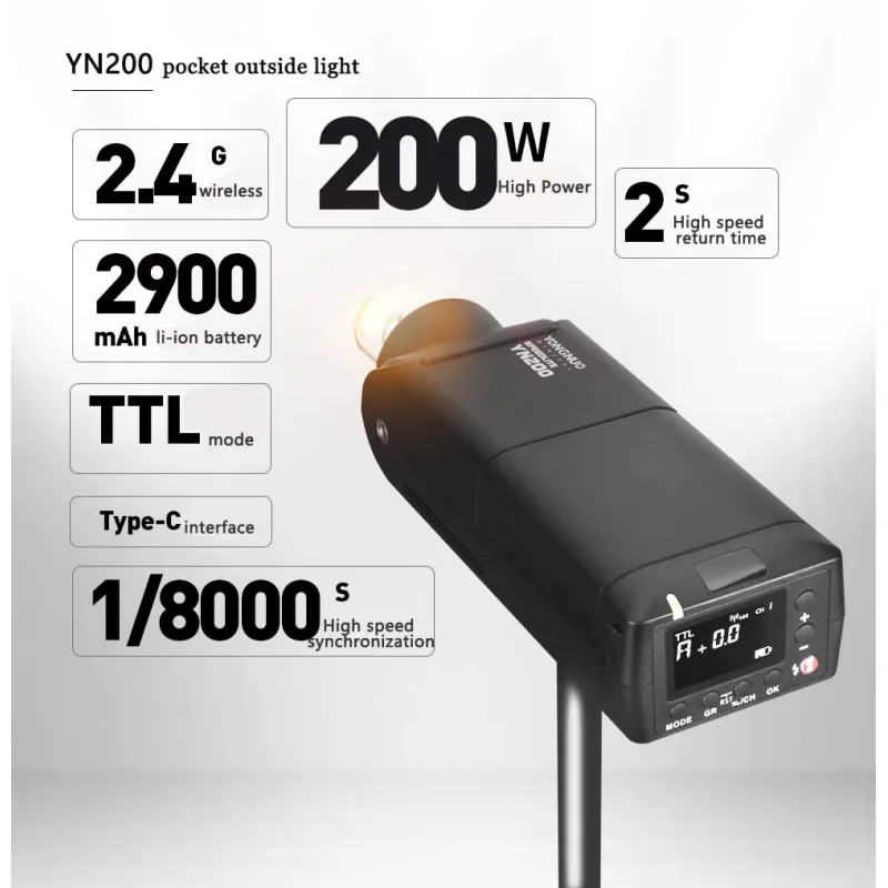 YN200 is the Yongnuo's first high-power outdoor flash, with flash power up to 200W, adopts 14.4v 2900mAh lithium battery power supply design, with extreme speed recycle system, 2 seconds recycling time , flash firing times at full output up to 500 times.