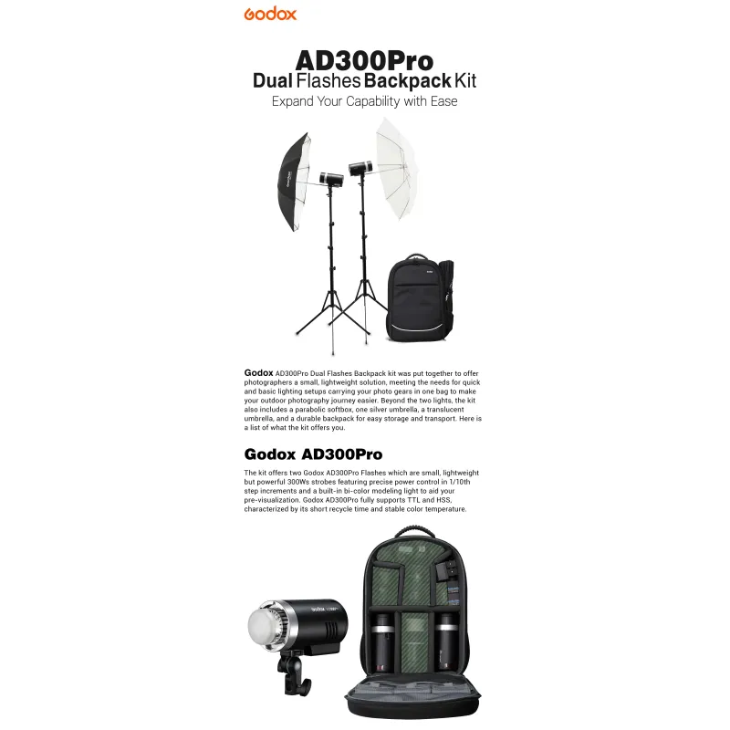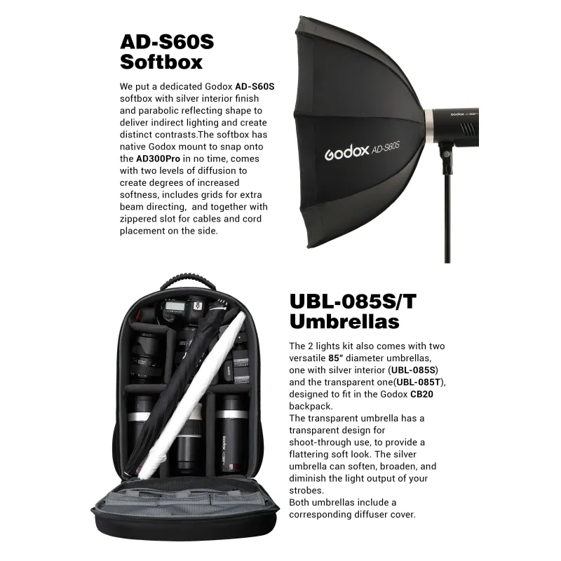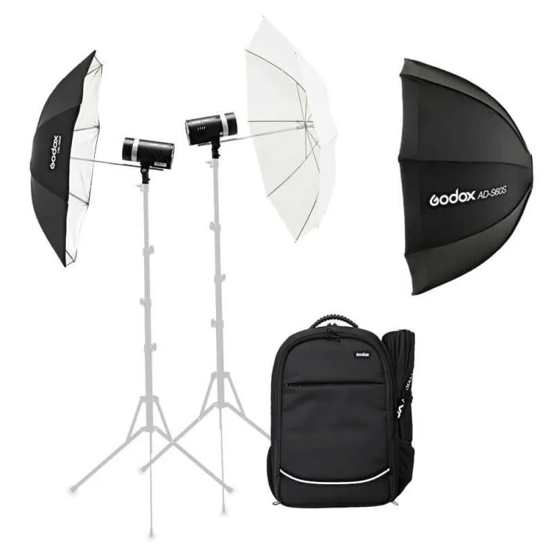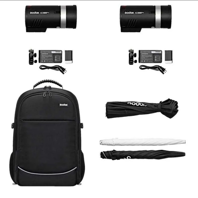 The kit includes two well known Godox AD300 PRO flashes. It is a complete tool that is characterized by an efficient battery, wireless remote control and the possibility of using a wide range of light modifiers.