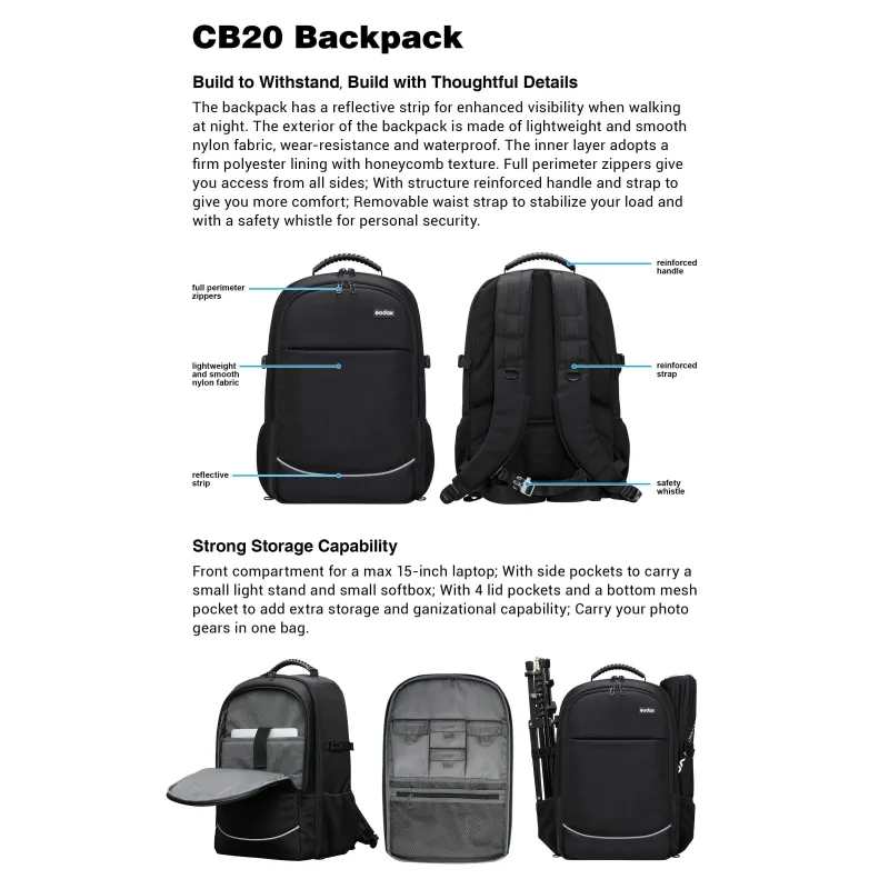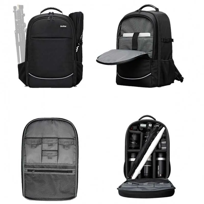 Front compartment for a max 15-inch laptop; With side pockets to carry a small light stand a small softbox; with 4 lid pockets and a bottom mesh pocket to add extra storage and organizational capability.