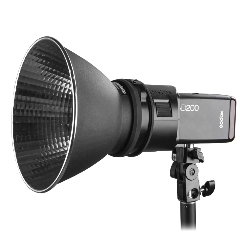 The Godox AD-P Profoto mount for AD200 is an adapter to use all kinds of Profoto accessories such as reflectors, softboxes and light shapers on your Godox AD200 studio flash. You replace the standard Godox mount using the click and turn system and then attach the Profoto mount.