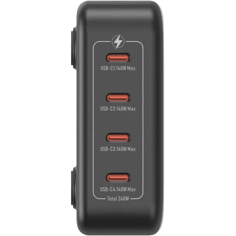 This power adapter features four ports, each supporting fast charging with a maximum output of 140W using PD3.1, enhancing charging efficiency for powerful devices. Each output port is equipped with short-circuit and overload protection for safe usage. Its compact design makes it ideal for travel and daily use.