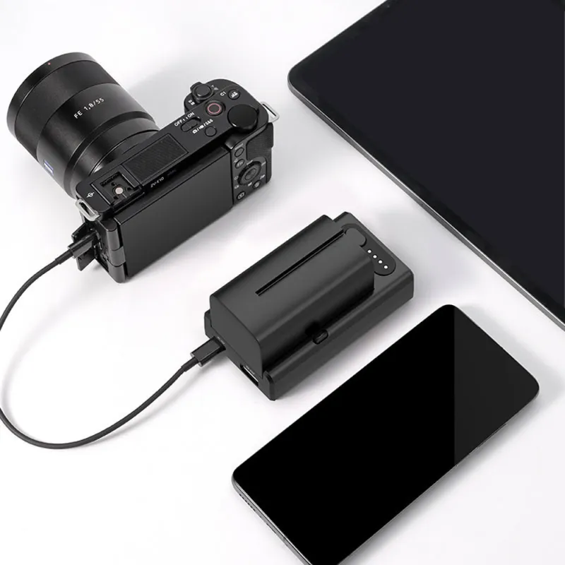The Ulanzi NP F01 Multifunctional NP F Battery Charger is a versatile charger that features multiple output interfaces, allowing it to provide emergency power to phones, tablets, laptops, cameras, and other devices. It supports simultaneous charging of multiple devices and can be used while charging.