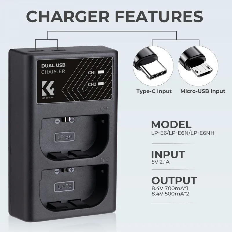 FLPE6NH Двухканальное зарядное устройство для цифровых фотоаппаратов с кабелем для зарядки type-c. Совместимые аккумуляторы, например, Canon EOS R5, EOS R6, EOS R, EOS 5D Mark IV, 5D Mark III, 5DS, 5DS R, 5D Mark II, 6D, 6D Mark II, 7D, 7D Mark II, 90D, 80D, 70D, 60D.