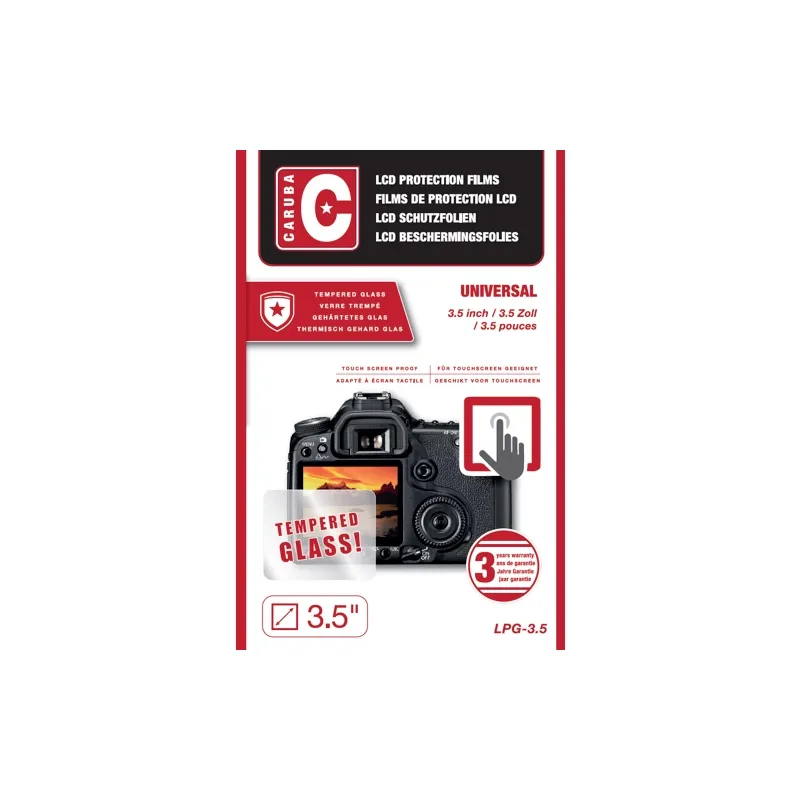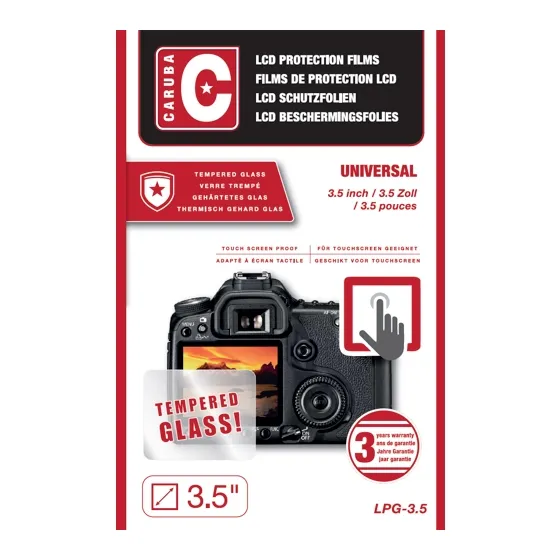 Caruba LCD Optical Glass Protector 3,5" (2 Pieces) The Caruba LCD Optical Glass Protector is a thin, optical glass layer of only half a millimeter thick with which you can protect the display of your camera. The screen protector is easy to attach and thanks to the high light transmittance you simply have a good view of the image and all information on your screen.
