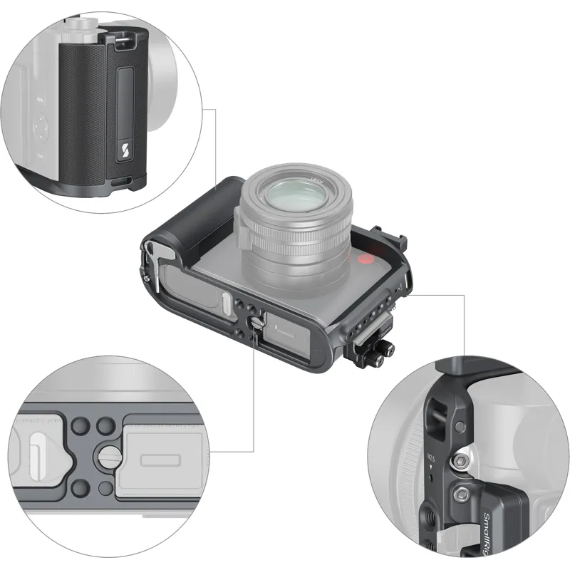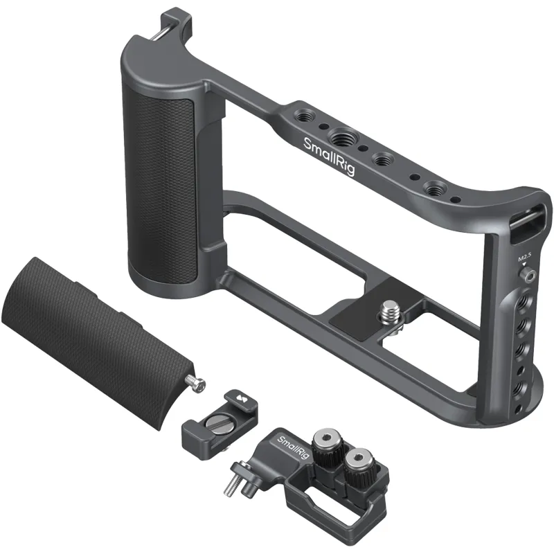 Клетка оснащена отверстиями для винтов 1/4-20, отверстиями для крепления ARRI и отверстиями для крепления 1/4-20, что позволяет крепить такие аксессуары, как верхняя ручка SmallRig 2165 или боковые ручки 4015 & 4346 для стабилизации движения камеры при съемке с рук.