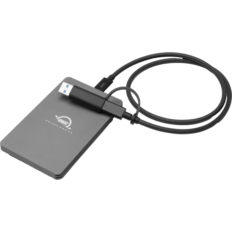OWC Thunderbolt kabelis iekļauts komplektā OWC Envoy Pro FX komplektācijā ir iekļauts sertificēts 0,7 m OWC Thunderbolt kabelis ar pieslēgtu Thunderbolt (USB-C) uz USB-A adapteri, kas nodrošina universālu savietojamību ar Thunderbolt un USB 3 / USB-A ierīcēm. Taču, ja jūsu darba plūsmai ir nepieciešams cits savienojuma garums, OWC Thunderbolt (USB-C) kabeļi ir lieliska izvēle.