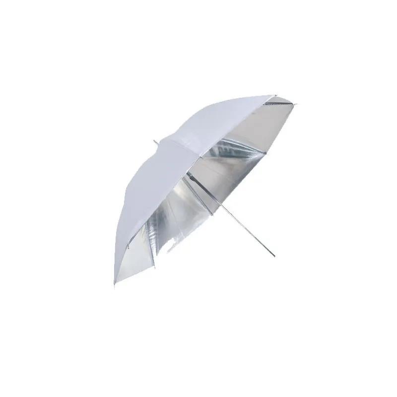 This Linkstar flash umbrella PUK-84SW has a silver interior coating and a white exterior coating. With a simple action, it's possible to invert the cover. This way you can get a white interior or a silver interior. An umbrella with a silver reflecting inside reflects fairly hard light. When using a white reflecting inside, you can generate a softer silver effect.